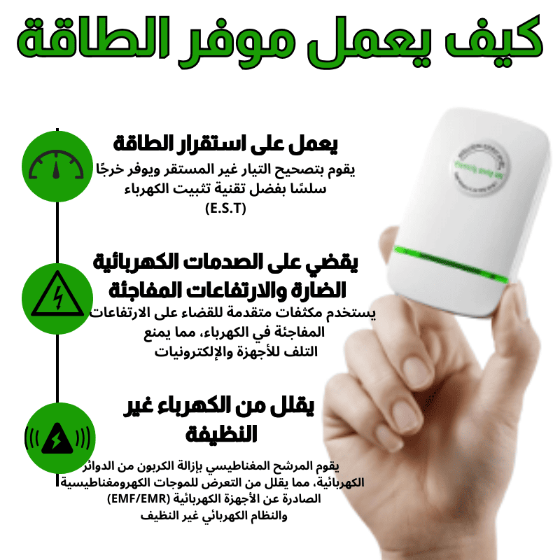جهاز موفر للطاقة مصمم لتحسين كفاءة استهلاك الكهرباء، مما يساعد في تقليل الفواتير الكهربائية عبر استقرار التيار الكهربائي وتقليل الفاقد من الطاقة.